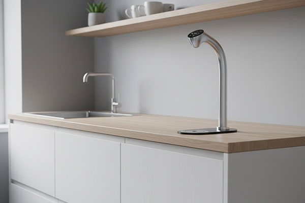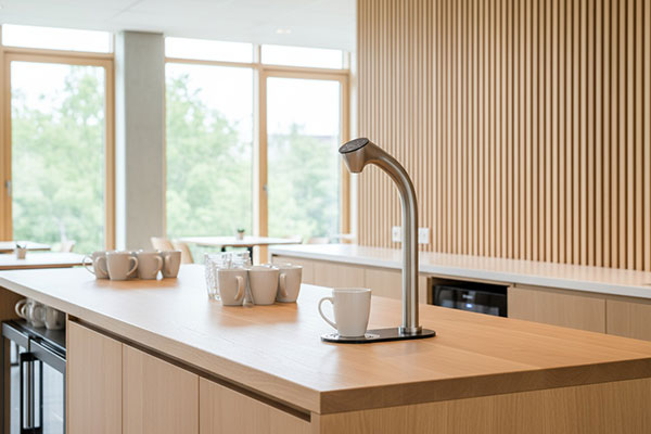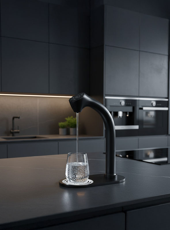 Smart & stylish: brushed stainless-steel designer tap with glass touch panel above the counter; filter, carbonator, cooler and boiler out of sight below. Five water types: unchilled or chilled still, semi-sparkling and sparkling – plus instant hot water for more efficient hot beverage drinks making in the workplace.